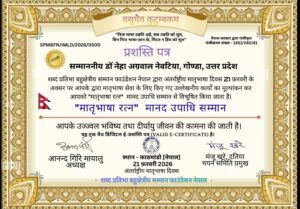 अंतरराष्ट्रीय मंच पर गोंडा की प्रतिभा का हुआ सम्मान: नेपाल की राजधानी काठमांडू में ‘मातृभाषा रत्न’ उपाधि से नवाजी गईं डॉ नेहा अग्रवाल